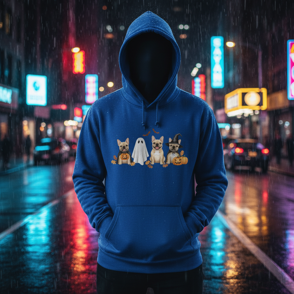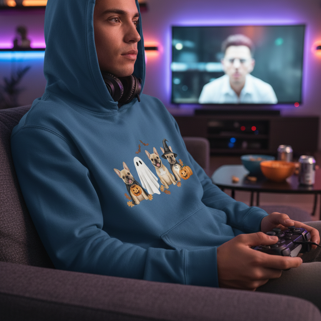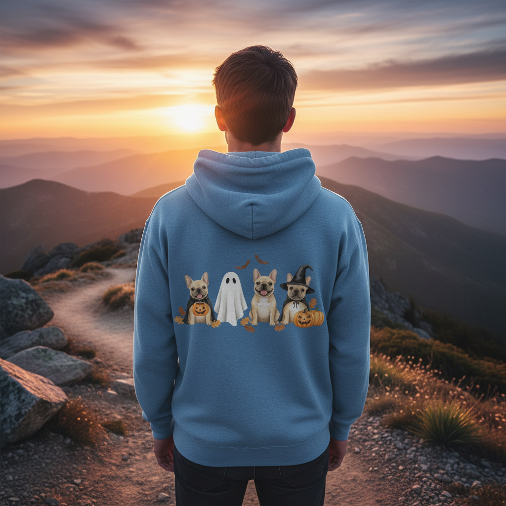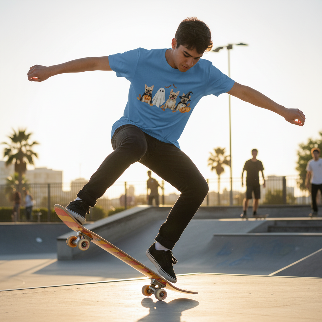 Celebrate spooky season with this Halloween Dog Comfort Colors Shirt, featuring a cute French Bulldog surrounded by pumpkins, ghosts, and bats. Perfect for Frenchie lovers, this festive fall tee makes a fun Halloween outfit or a cozy addition to your autumn wardrobe.