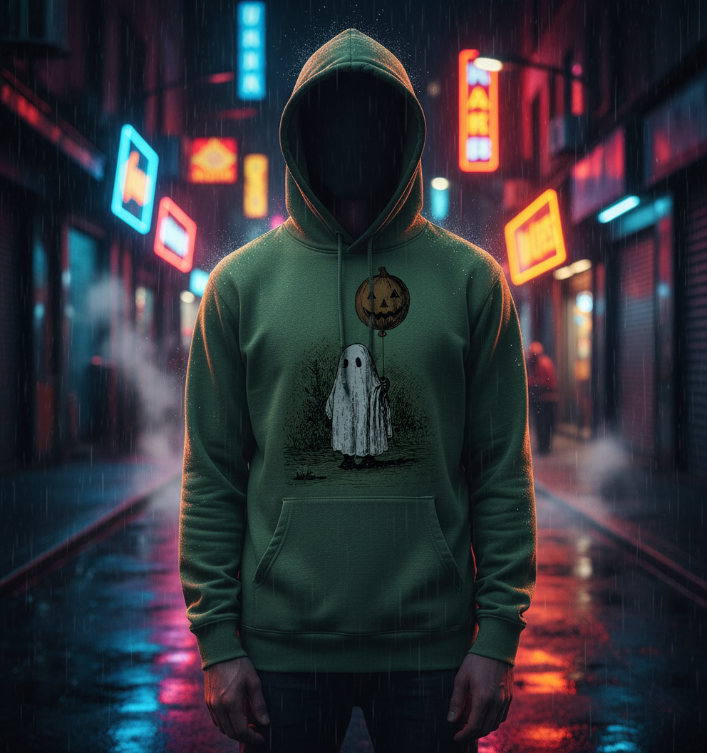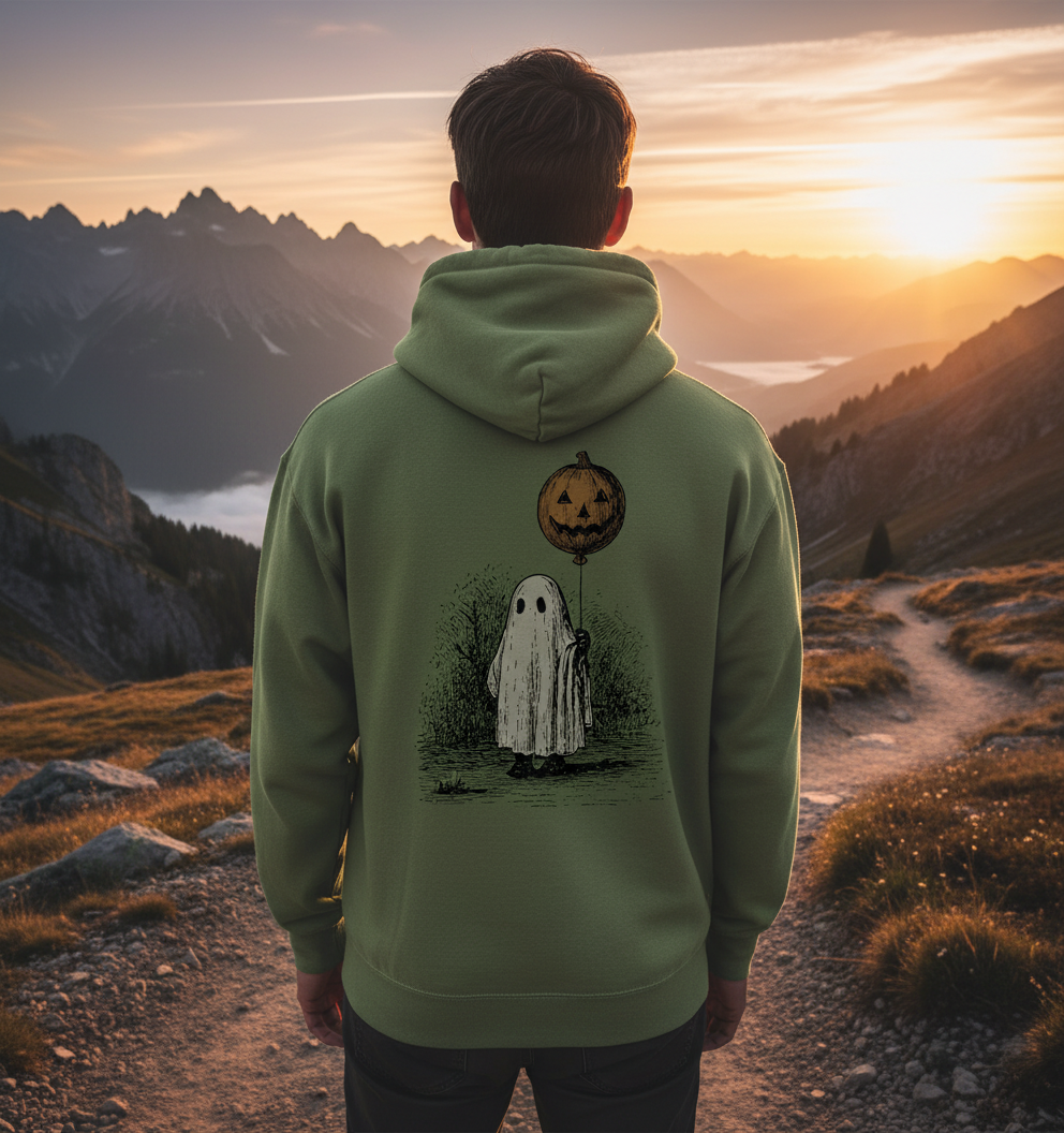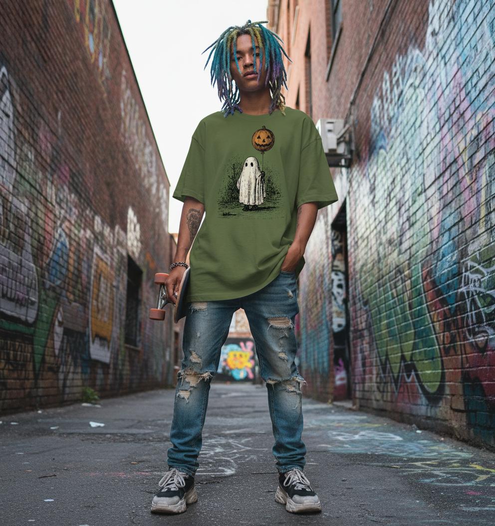 Bring cozy Halloween vibes to your fall wardrobe with this cute ghost and pumpkin t-shirt! Featuring a vintage-style illustration of a little ghost under a glowing pumpkin moon, this tee is perfect for spooky season lovers.